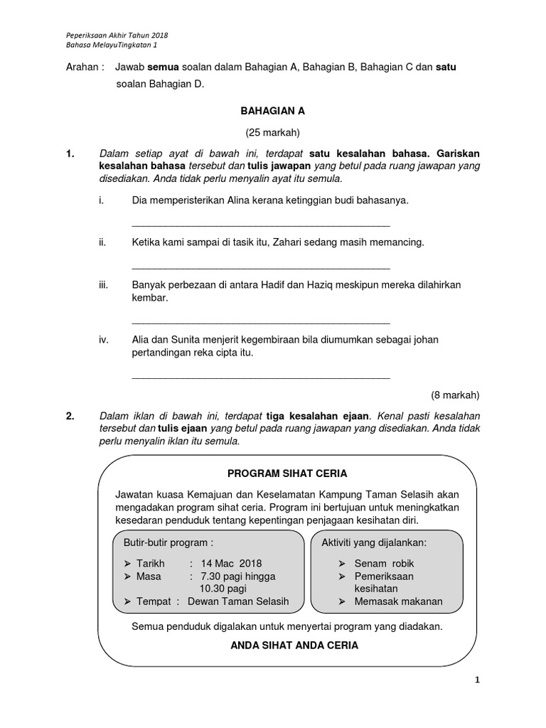 Semoga para pelajar mempoleh bermanafaat dari bahan yang disediakan. Soalan peperiksaan akhir tahun bahasa melayu tingkatan 1. Koleksi Kertas Soalan Peperiksaan.